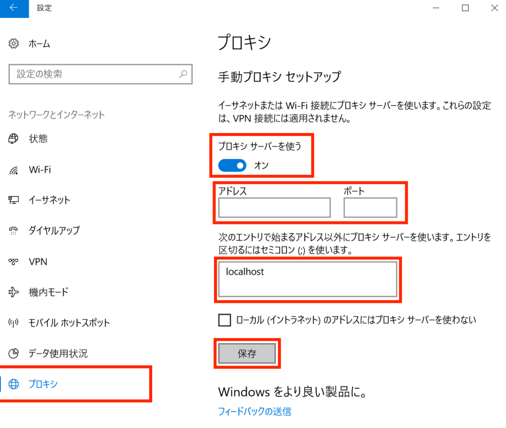 「アドレス」と「ポート」にプロキシサーバーのアドレスとポートをそれぞれ入力します。